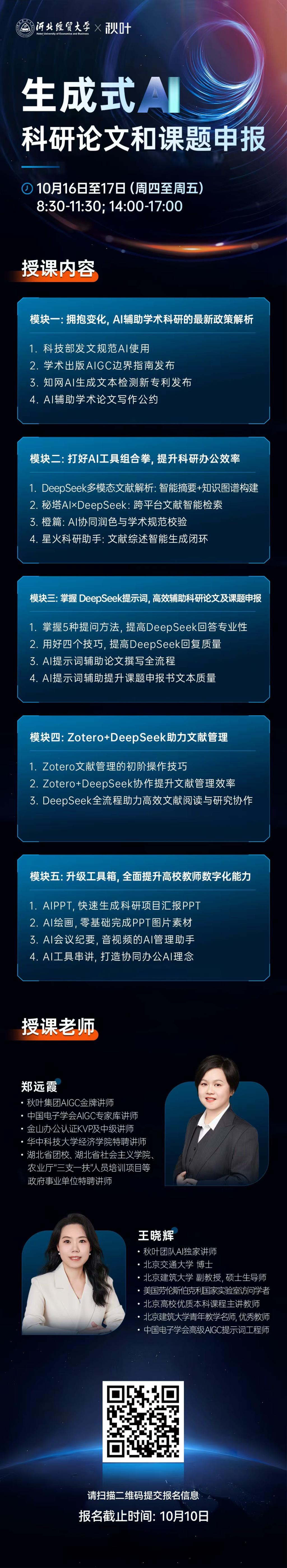 随着人工智能技术在科研领域的深度应用,生成式AI已成为提升科研效率、优化课题申报质量的重要工具。为深入贯彻落实全国研究生教育会议精神,进一步加强师德师风建设,全面落实立德树人根本任务,着力打造一支具备前沿科研能力的高水平研究生导师队伍,切实提高导师在科研论文撰写、课题申报材料打磨等方面的专业能力,推动公司研究生教育高质量发展,经研究,公司决定开展“生成式AI科研论文和课题申报”主题培训会。现将有关事宜通知如下: